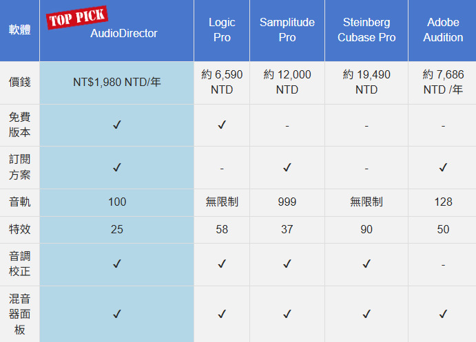 以下的簡易表格,提供上述五款音檔剪輯軟體的快速比較:
