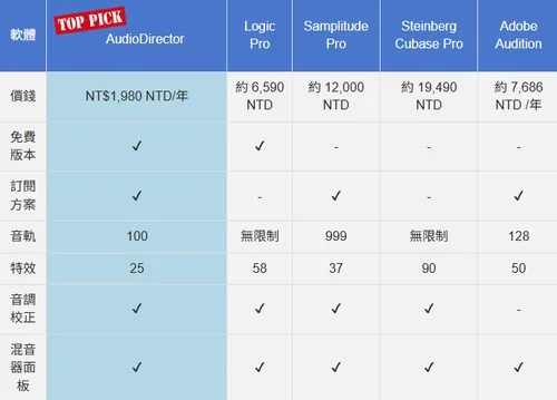 以下的簡易表格,提供上述五款音檔剪輯軟體的快速比較: